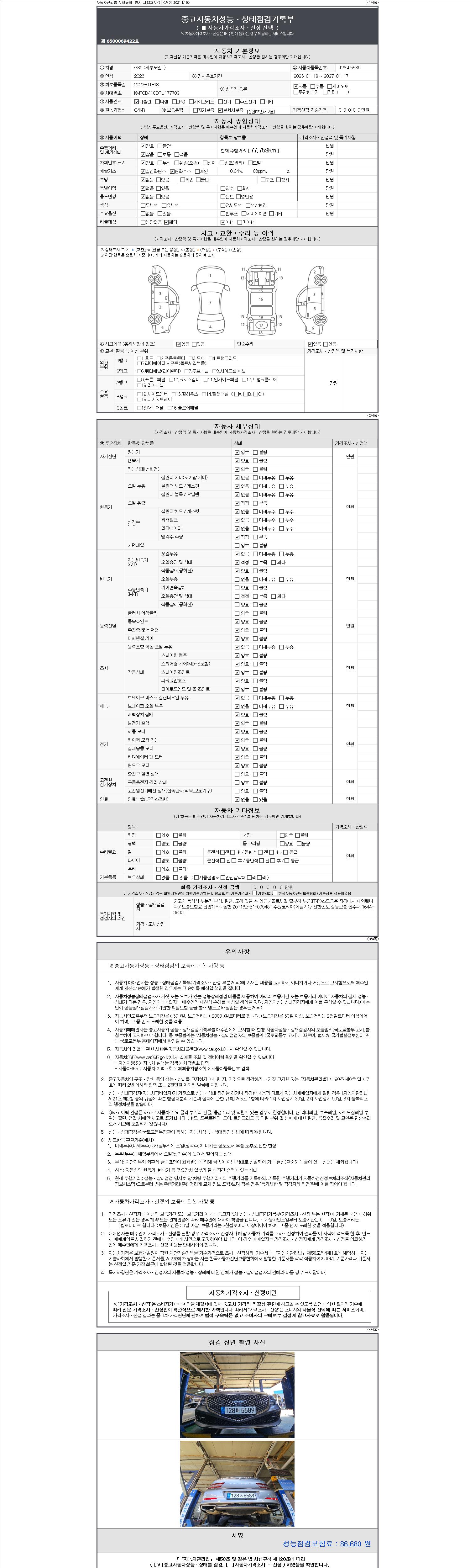 | 주행거리 | 77,759 km | 차량번호 | 128버5589 | 사고유무 | 성능기록부 참조 | 제시번호 | 제 2147483647 호 |