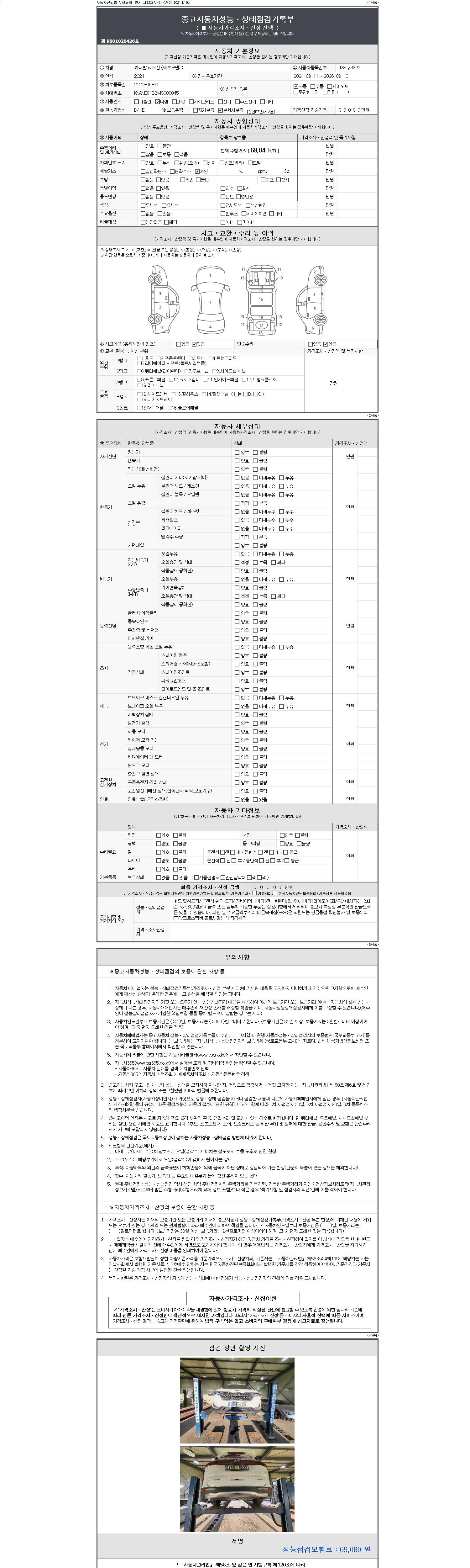 | 주행거리 | 69,841 km | 차량번호 | 185구3823 | 사고유무 | 성능기록부 참조 | 제시번호 | 제 2147483647 호 |