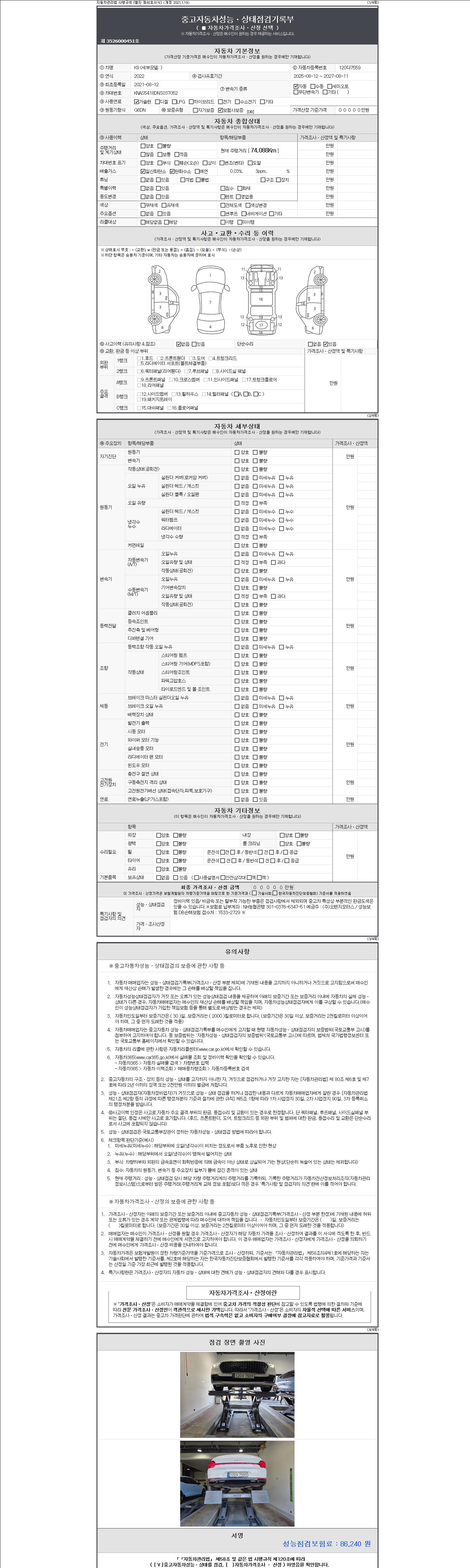 | 주행거리 | 74,088 km | 차량번호 | 120다7559 | 사고유무 | 성능기록부 참조 | 제시번호 | 제 2147483647 호 |
