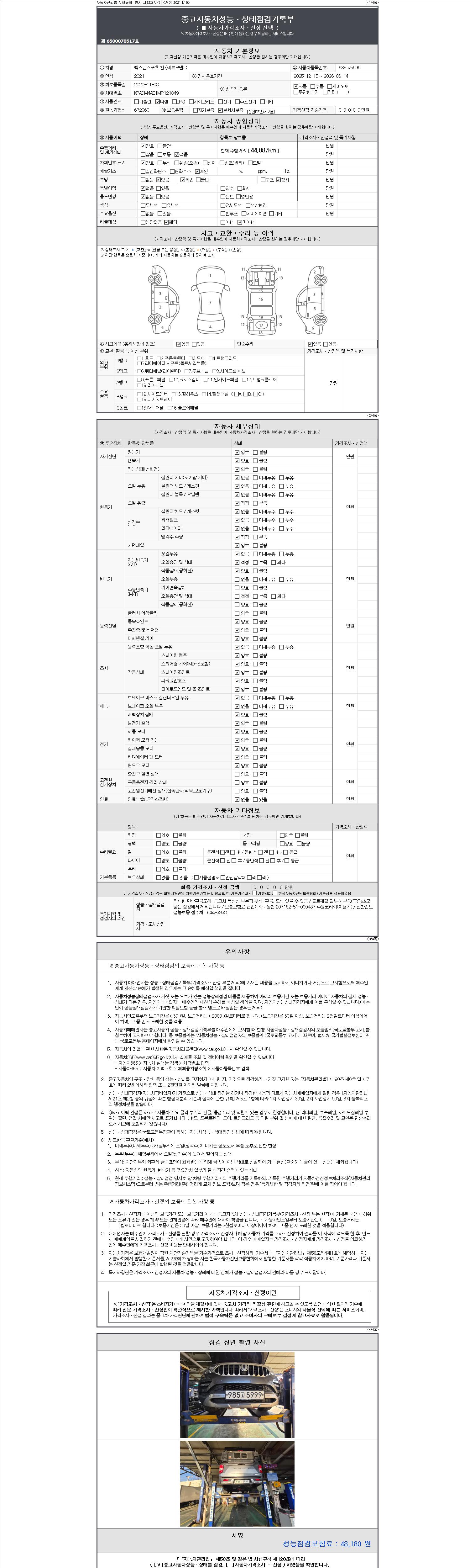 | 주행거리 | 44,887 km | 차량번호 | 985고5999 | 사고유무 | 성능기록부 참조 | 제시번호 | 제 2147483647 호 |