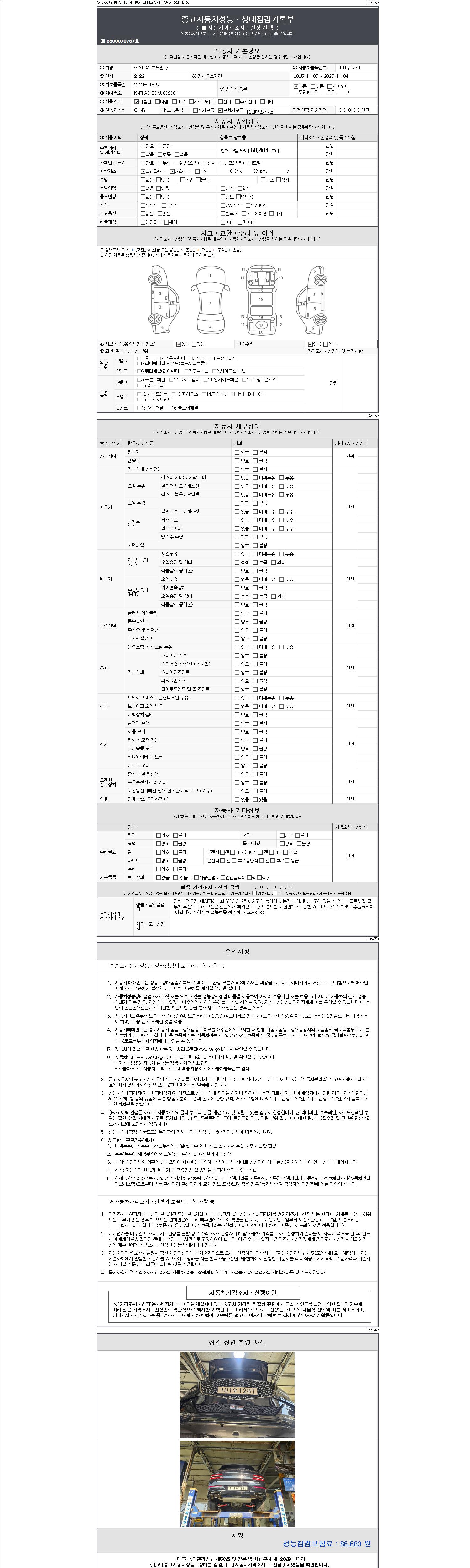 | 주행거리 | 68,404 km | 차량번호 | 101우1281 | 사고유무 | 성능기록부 참조 | 제시번호 | 제 2147483647 호 |