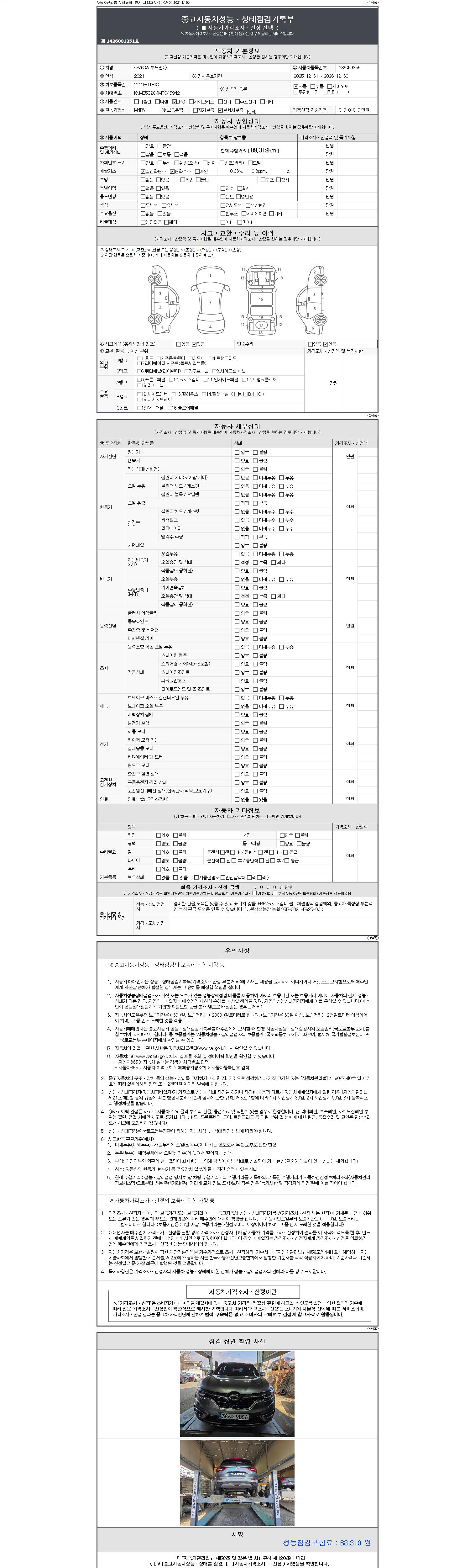 | 주행거리 | 89,319 km | 차량번호 | 386머9856 | 사고유무 | 성능기록부 참조 | 제시번호 | 제 2147483647 호 |