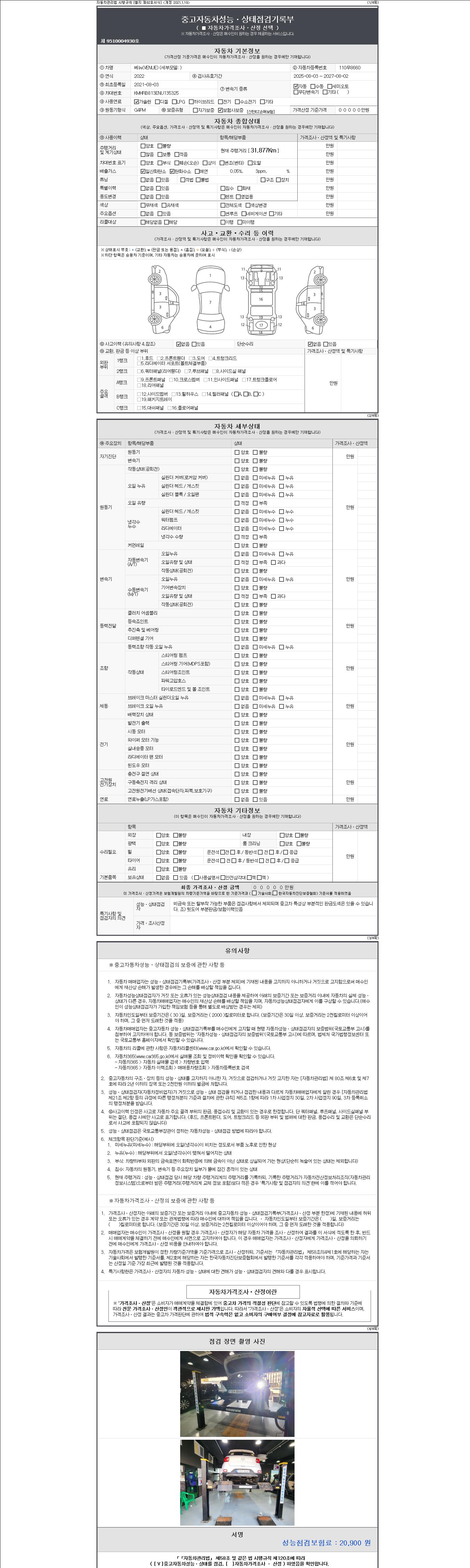 자동차관리법 시행규칙 제120조의 규정에 따라 별지 제 82호서식 《중고자동차 성능, 상태점검 기록부》를 발행한 성능, 상태점검자 및 매매자는 아래의 보증기간 또는 보증거리 이내의 중고자동차, 성능점검 기록부에 기재된 내용과 자동차의 실제 성능, 상태가 다른 경우 계약 또는 관계법령에 따라 매수인에 대하여 책임을 집니다.